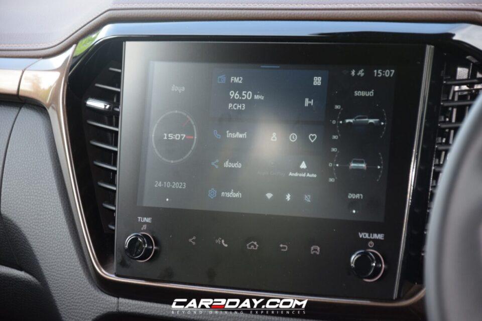 คอนโซลกลางติดตั้งช่องแอร์แนวตั้งซ้าย-ชวาพร้อมหน้าจอระบบสัมผัสใหม่ Infotainment Display ขนาด 9 นิ้ว ปุ่ม ข้อมูล และวิดเจ็ต (Widgets) จะแสดงบนหน้าหลักแสดงเวลา ข้อมูลตัวรถ และคลื่นวิทยุการเชื่อมต่อรองรับการใช้งานทั้งระบบไร้สายแบบ Android Auto และ Apple CarPlay เสียดายว่าไม่มีระบบนำทางในตัวตั้งแต่รุ่น V-Cross MAGIC EYEs เพราะคนส่วนมากหันมาใช้ Google Map เชื่อมจากสมาร์ตโฟนแทน**