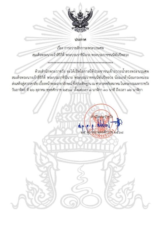 วันที่ 25 ต.ค.68 สำนักพระราชวัง ประกาศ เรื่อง การถวายสักการะพระบรมศพ สมเด็จพระนางเจ้าสิริกิติ์ พระบรมราชินีนาถ พระบรมราชชนนีพันปีหลวง