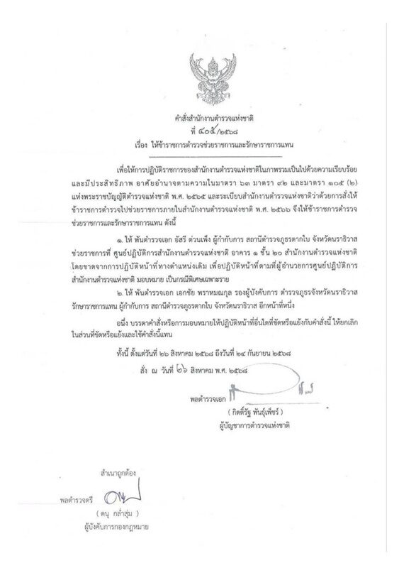 1. ให้ พ.ต.อ.อัสรี ต่วนเพ็ง ผกก.สภ.ตากใบ จว.นราธิวาส ช่วยราชการที่ศูนย์ปฏิบัติการสำนักงานตำรวจแห่งชาติ โดยขาดจากการปฏิบัติหน้าที่ทางตำแหน่งเดิม เพื่อปฏิบัติหน้าที่ตามที่ผู้อำนวยการศูนย์ปฏิบัติการสำนักงานตำรวจแห่งชาติ มอบหมาย เป็นกรณีพิเศษเศษเฉพาะราย