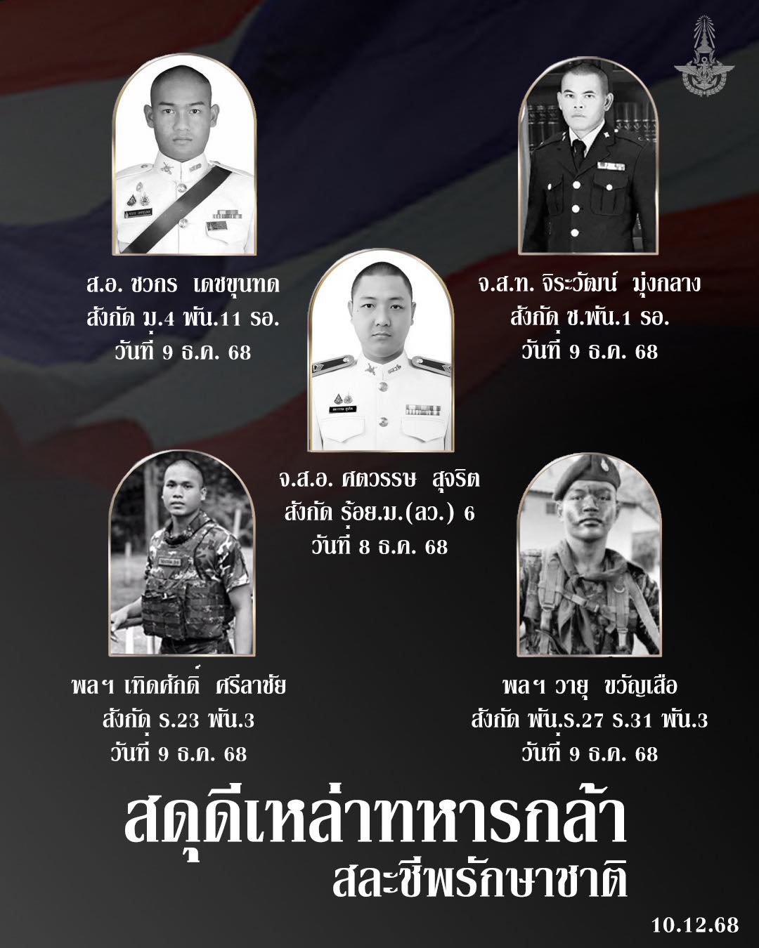 ขณะเดียวกัน ก่อนหน้านี้ กองบัญชาการกองทัพไทย เปิดเผยรายชื่อทหาร 5 นาย ที่เสียชีวิตจากการสู้รบตามแนวชายแดนไทย-กัมพูชา รอบที่ 2 ดังนี้