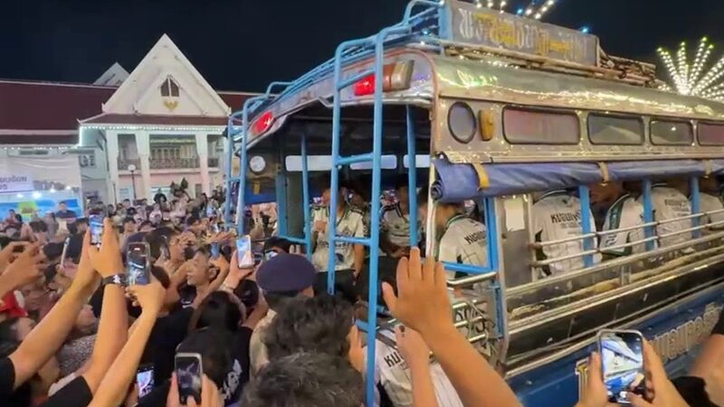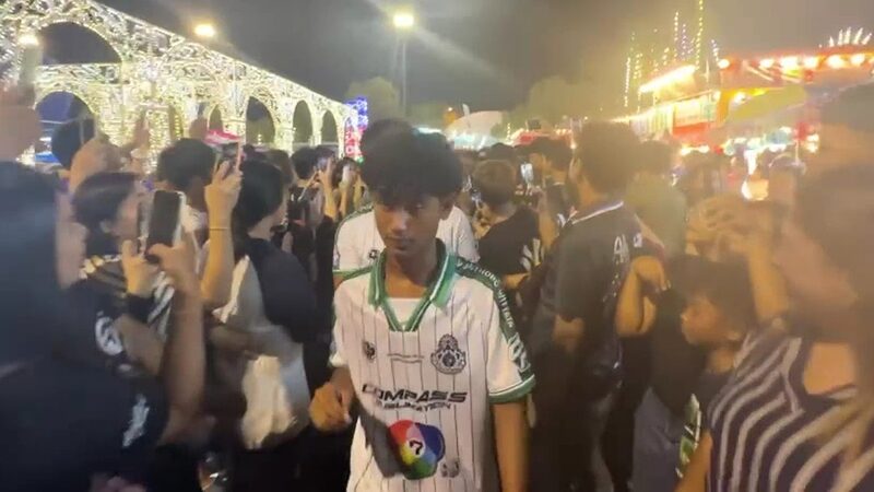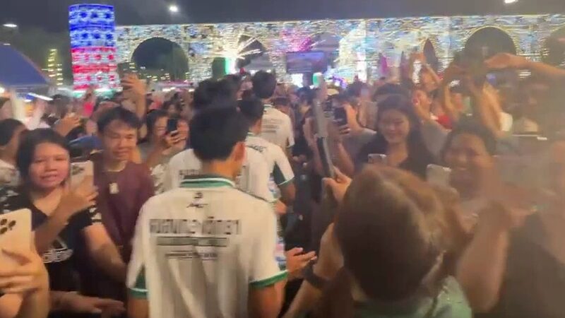 และเมื่อรถเคลื่อนเข้ามาถึงบริเวณสถานที่จัดงาน ก็พบว่ามีประชาชนนับพันคน ยืนรออยู่หน้าปากประตูทางเข้า เพื่อส่งเสียงตะโกนเรียก ถ่ายรูป ขอจับมือนักเตะ ทำให้กำลังเจ้าหน้าที่ตำรวจ อส. และเจ้าหน้าที่รักษาความปลอดภัยของงาน ต้องขยายพื้นเป็นทางให้ทีมนักเตะได้เดินเข้าไปยังเวทีกลางจัดงาน ซึ่งตลอด 2 ข้างทางนี้ก็มีแฟนคลับขอจับมือถ่ายรูปเป็นระยะ