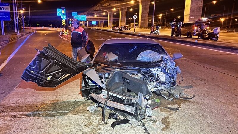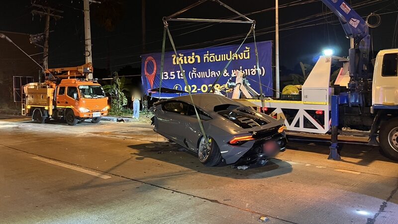 หนุ่มซิ่ง ลัมโบร์กินี ฮูราคัน ป้ายแดง พุ่งชนเสาไฟฟ้า รถพังยับ ล้อขาดติดโคนเสาไฟ ถนนรัตนาธิเบศร์ สาวนั่งมาด้วยเจ็บเล็กน้อย พบมีอาการคล้ายเมาสุรา