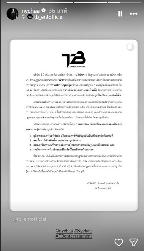 และในส่วนของ บริษัท ทีบี เอ็นเตอร์เทนเม้นท์ ในฐานะต้นสังกัดของ ณิชา ได้ออกมาปกป้องศิลปินว่า “บริษัทได้มีการตรวจสอบพบว่ามีเพจ เฟซบุ๊ก อาทิ เพจท่านเปา , มนุษย์ตุ๊ด รวมถุงเพจเฟซบุ๊กอื่นๆ และบุคคลอีกหลายราย ได้เผยข้อความในลักษณะที่เป็นการ กุข่าวลือและใส่ความอันเป็นเท็จ โดยกล่าวอ้างว่า ณิชาได้กลับไปคบหากับอดีตแฟนหนุ่มซึ่งได้เลิกรากันไปเป็นเวลานานแล้ว ซึ่งเป็นข้อมูลที่ไม่เป็นความจริงทั้งสิ้น