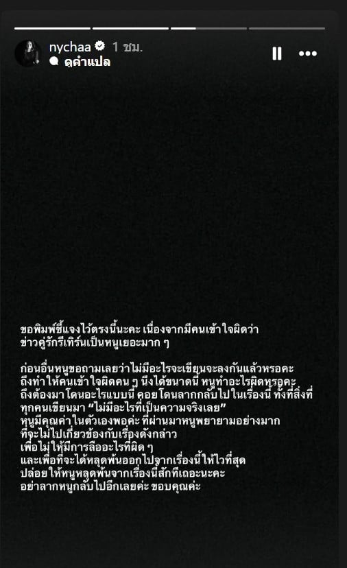 นอกจากนี้ได้ชี้แจงอีกว่า “ขอพิมพ์ชี้แจงไว้ตรงนี้นะคะ เนื่องจากมีคนเข้าใจผิดว่าข่าวคู่รักรีเทิร์นเป็นหนูเยอะมากๆ ก่อนอื่นหนูขอถามเลยว่าไม่มีอะไรจะเขียนจะลงกันแล้วเหรอคะ ถึงทำให้คนเข้าใจผิดคนๆ นึงได้ขนาดนี้ หนูทำอะไรผิดเหรอคะ ถึงต้องมาโดนอะไรแบบนี้ คอยโดนลากกลับไปในเรื่องนี้ ทั้งที่สิ่งที่ทุกคนเขียนมา “ไม่มีอะไรที่เป็นความจริงเลย” หนูมีคุณค่าในตัวเองพอค่ะ ที่ผ่านมาหนูพยายามอย่างมากที่จะไม่ไปเกี่ยวข้องกับเรื่องดังกล่าว เพื่อไม่ให้มีการลืออะไรที่ผิดๆ และเพื่อที่จะได้หลุดพ้นออกไปจากเรื่องนี้ให้ไวที่สุด ปล่อยให้หนูหลุดพ้นจากเรื่องนี้สักทีเถอะนะคะ อย่าลากหนูกลับไปอีกเลยค่ะ ขอบคุณค่ะ”