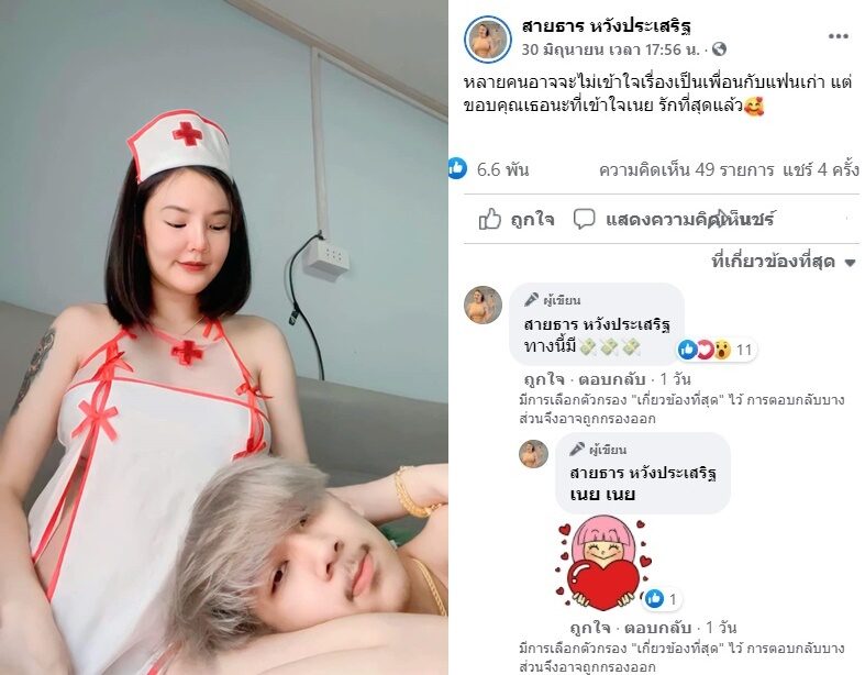 น้องเนย ยังโพสต์อีกว่า คนที่บอกว่าเนยไม่ให้เกียรติแฟนเนยและแฟนใหม่พี่เขา(พี่เก่ง) ที่โพสหรือลงรูปคู่พี่เก่ง และที่เนยบอกว่ารัก ก็คือรักแบบพี่น้องคะ เราทั้งหมดเข้าใจและรู้ว่าอะไรคืออะไร ไม่มีนอกไม่มีนัย เราแค่ทำงานร่วมกัน เนยว่าคนที่เป็นแฟนคลับเนยกับพี่เก่งจริงๆจะเข้าใจนะคะ ขอบคุณที่ยังอยู่ข้างๆค่ะ