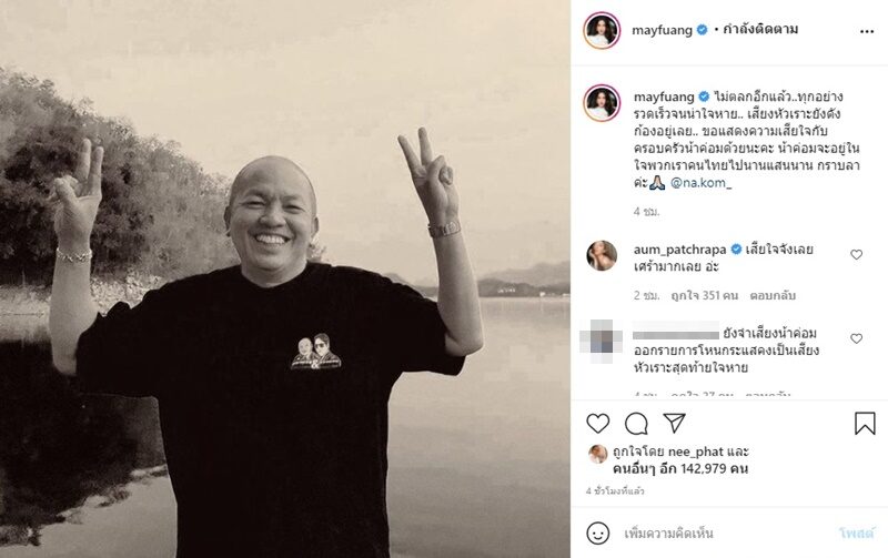 ทั้งวงการโศกสลด คนบันเทิงสูญเสีย น้าค่อม ชวนชื่น จากการติดเชื้อโควิด-19 ล่าสุด เมย์ เฟื่องอารมย์ หรือ เมย์ ปทิดา กำเนิดพลอย ก็โพสต์อาลัยเป็นภาพขาวดำของน้าค่อม ดาวตลกผู้ล่วงลับ พร้อมข้อความสุดเศร้าว่า
