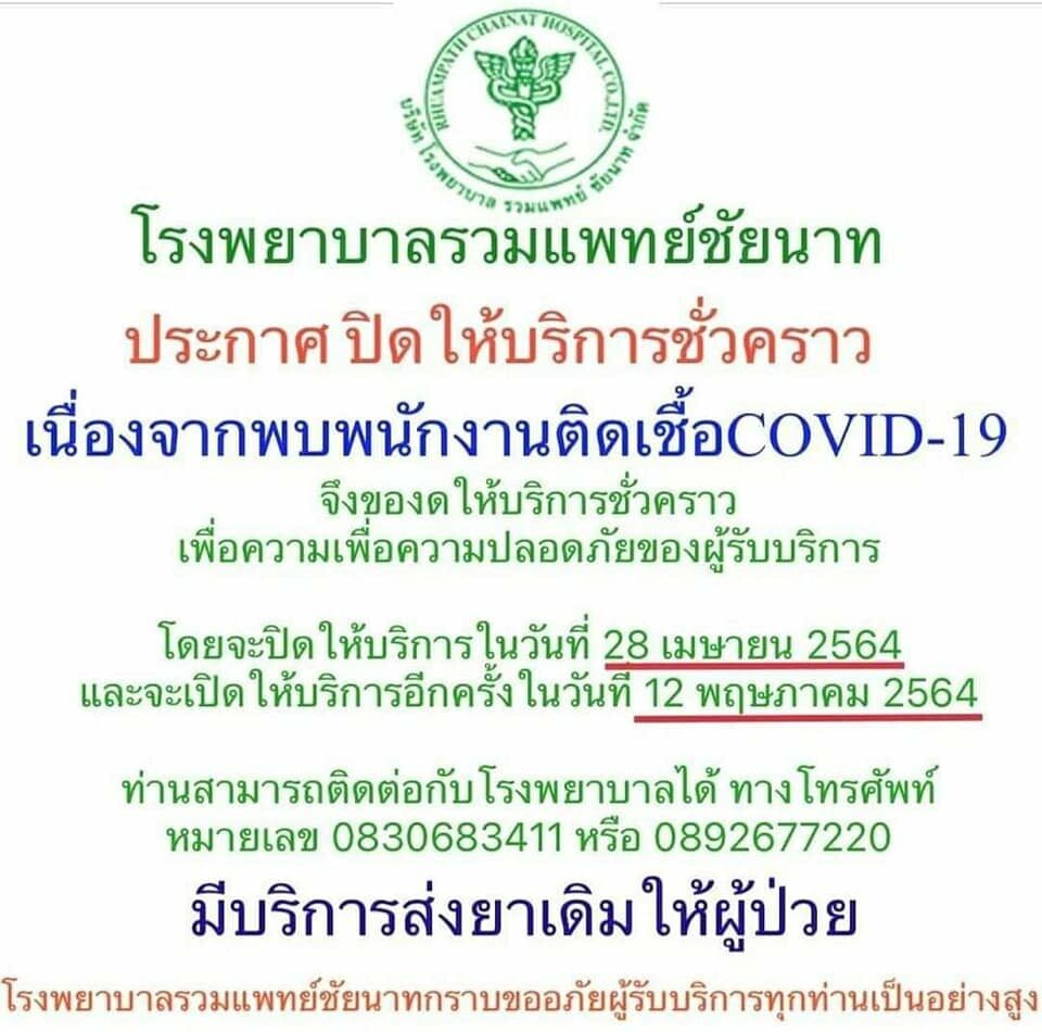 เมื่อวันที่ 28 เม.ย.64 ผู้สื่อข่าวรายงานว่า โรงพยาบาลรวมแพทย์ชัยนาท ประกาศแจ้งว่า มีพนักงานเวรเปล โรงพยาบาลรวมแพทย์ชัยนาท ตรวจพบเชื้อโควิด-19 จำนวน 1 ราย และเข้ารับการรักษาตัวแล้ว ซึ่งทางรพ.รวมแพทย์ชัยนาท ตระหนักถึงความปลอดภัยของผู้มารับบริการ จึงทำความสะอาด และกักตัวพนักงานกลุ่มที่มีความเสี่ยงสูงทั้งหมดทันที ซึ่งภายหลักโรงพยาบาลรวมแพทย์ชัยนาท ยังประกาศปิดให้บริการชั่วคราว เนื่องจากพนักงานติดเชื้อโควิด-19 โดย โรงพยาบาลรวมแพทย์ชัยนาท จึงของดให้บริการเพื่อความปลอดภัยของผู้นับบริการ โดยปิดให้บริการระหว่าง วันที่ 28 เม.ย. - 12 พ.ค.64