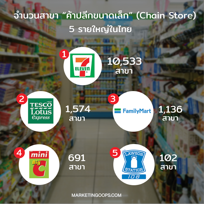 โดยในปี 2560 ร้านค้าปลีกขนาดเล็กในไทย (Chain Store) มีทั้งหมด 15,883 สาขา โดยในจำนวนนี้ “เซเว่น อีเลฟเว่น” ครองส่วนแบ่งการตลาดมากสุด รองลงมาคือ “เทสโก้ โลตัส เอ็กซ์เพรส” และ “แฟมิลี่มาร์ท” (ข้อมูลจากรายงานประจำปี 2560 ของซีพีออลล์)