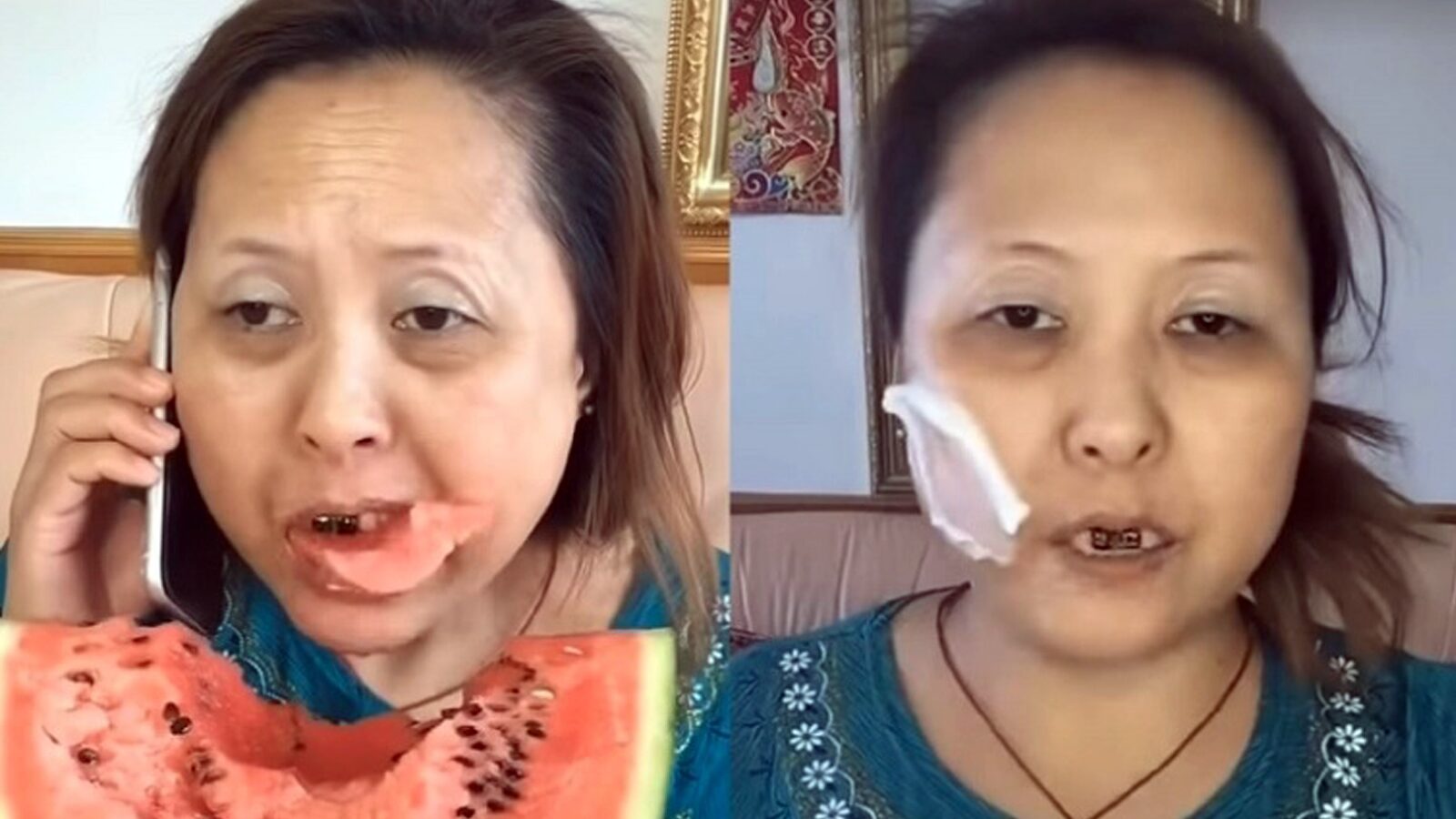 โดยภาพแรกแสดงให้เห็นถึงหญิงวัยกลางคนที่ยังไม่ได้แต่งหน้า บนใบหน้ามีริ้วรอยของวัยอย่างเห็นได้ชัด เธอแต่งตัวอย่างสบาย ๆ และมีผมเผ้ายุ่งเหยิง จงใจทาฟันสีดำ ทำท่าทีว่ากำลังนั่งกินแตงโมและคุยโทรศัพท์