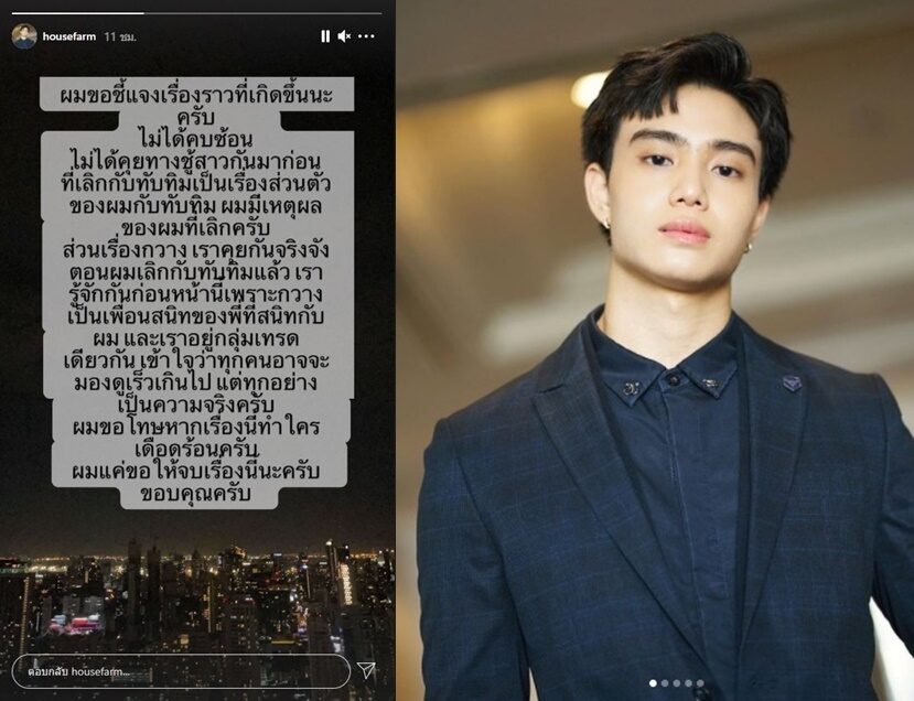 "ส่วนเรื่องของกวาง เราคุยกันจริงจัง ตอนผมเลิกกับทับทิมแล้ว เรารู้จักกันก่อนหน้านี้ เพราะกวางเป็นเพื่อนสนิทอยู่กลุ่มเทรดเดียวกัน เข้าใจว่าทุกคนอาจจะมองดูเร็วเกินไป แต่ทุกอย่างเป็นความจริงครับ ผมขอโทษหากเรื่องนี้ทำใครเดือดร้อนครับ ผมแค่ขอให้จบเรื่องนี้นะครับ ขอบคุณครับ"
