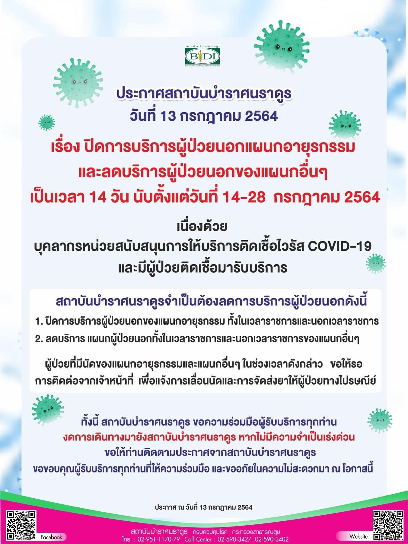 โดยระบุว่า เนื่องด้วยบุคลากรหน่วยสนับสนุนการให้บริการติดโควิด และมีผู้ป่วยติดเชื้อมารับบริการ สถาบันบำราศนราดูรจำเป็นต้องลดบริการผู้ป่วยนอกดังนี้