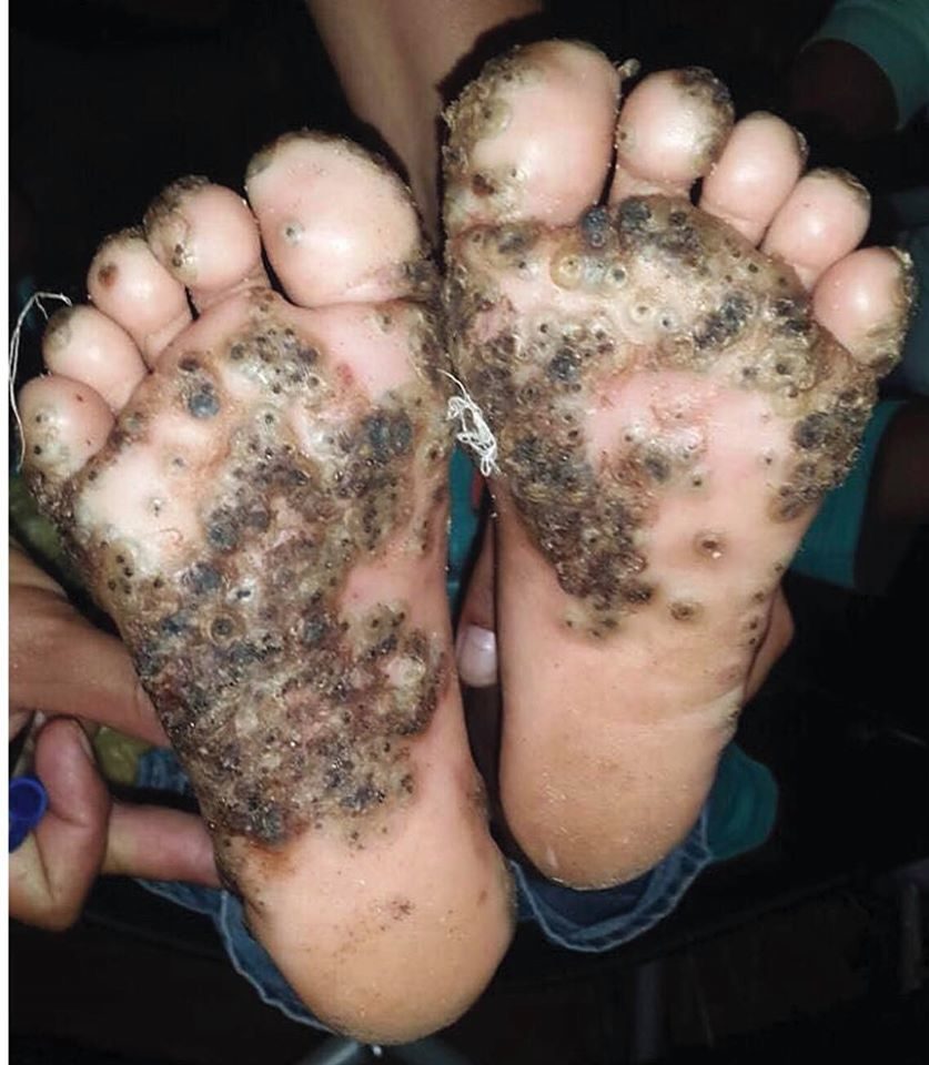 เด็กหญิงอายุ 10 ขวบ มีตุ่มนูนจำนวนมากที่ฝ่าเท้า และมีอาการเจ็บ บริเวณตรงกลางตุ่มมีจุดสีดำ ผู้ป่วยมีประวัติว่าเดินเล่นเท้าเปล่า บริเวณคอกหมูแห่งหนึ่งในชนบทของประเทศบราซิลเมื่อ 2 สัปดาห์ก่อน