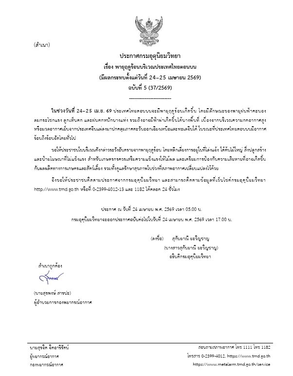 ประกาศ ณ วันที่ 24 เมษายน พ.ศ. 2569 เวลา 05.00 น. ทั้งนี้ กรมอุตุนิยมวิทยาจะออกประกาศฉบับต่อไปในวันที่ 24 เมษายน พ.ศ. 2569 เวลา 17.00 น.