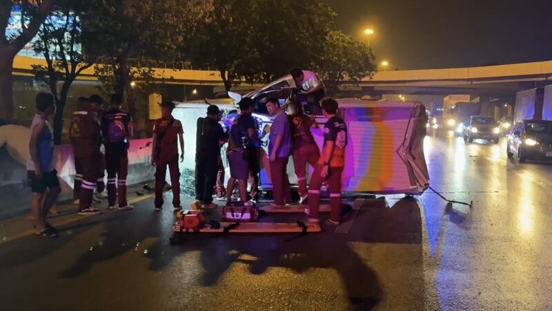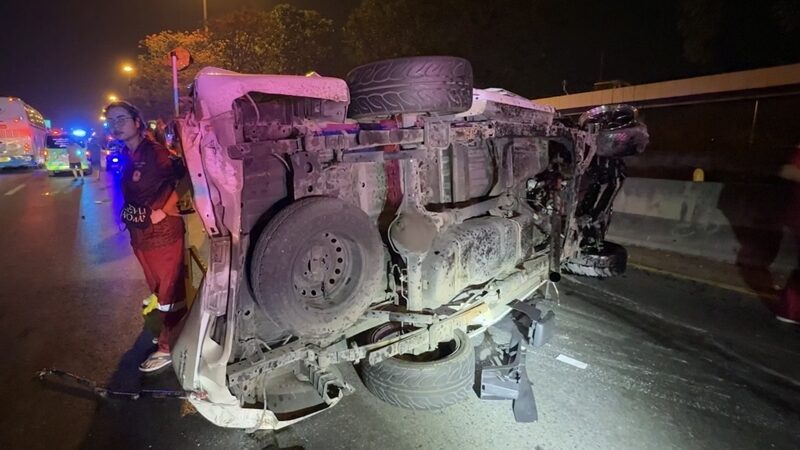 หนุ่มขับกระบะกำลังจะไปเที่ยว งานวันไหล ถูกจยย.ตัดหน้า หักหลบเสียหลักพุ่งอัดแท่งแบริเออร์ หมุนพลิกตะแคงข้างรถพังยับเยิน บาดเจ็บระนาว 5 ราย