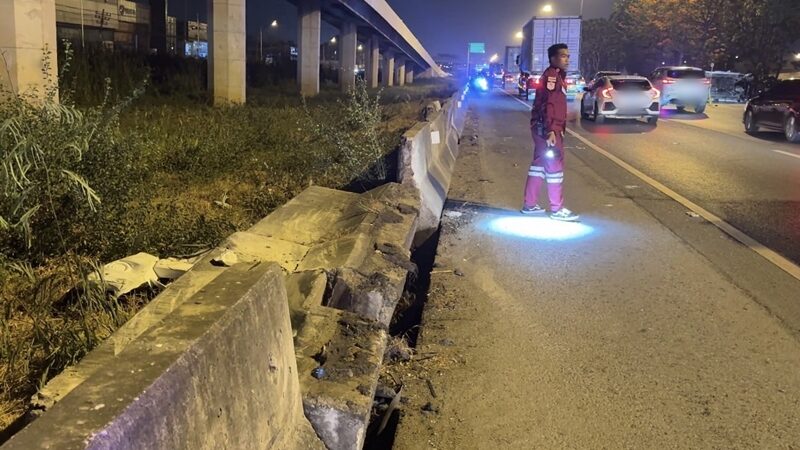 ตรวจสอบเบื้องต้นพบร่องรอยการชนที่แบริเออร์ฝั่งซ้าย และมีชิ้นส่วนรถกระจัดกระจายทั่วพื้นผิวจราจร คาดว่ารถเสียหลักพุ่งชนแบริเออร์ด้านซ้าย ก่อนหมุนไปกระแทกแบริเออร์กลางถนนฝั่งขวาแล้วพลิกคว่ำ อย่างไรก็ตาม ไม่มีรถคันอื่นพุ่งชนซ้ำ ทำให้ไม่มีผู้เสียชีวิต