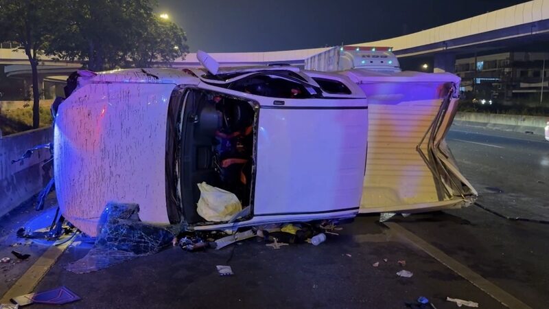 ระหว่างทางพบรถจักรยานยนต์ตัดหน้า ทำให้คนขับหักหลบอย่างกะทันหัน จนรถเสียหลักพุ่งชนแบริเออร์ข้างทาง ก่อนหมุนและพลิกคว่ำกลางถนน