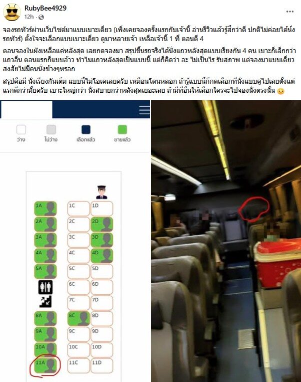 ผู้ใช้เฟซบุ๊กรายหนึ่ง โพสต์ภาพและข้อความลงในกลุ่มพวกเราคือผู้บริโภคเพื่อแชร์ข้อมูลปัญหาการซื้อตั๋วรถทัวร์ ความว่า จองรถทัวร์ผ่านเว็บไซต์มาแบบเบาะเดี่ยว (เพิ่งเคยจองครั้งแรกกับเจ้านี้ อ่านรีวิวแล้วรู้สึกว่าดี ปกติไม่ค่อยได้นั่งรถทัวร์) ตั้งใจจะเลือกแบบเบาะเดี่ยว ดูมาหลายเจ้า เหลือเจ้านี้ 1 ที่ ตอนตี 4