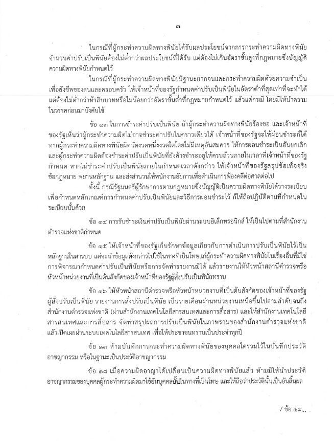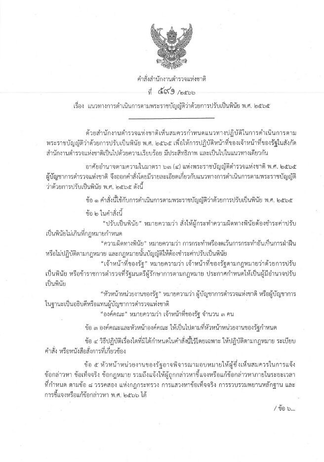 ทั้งนี้ ยืนยันว่า ตร. มีความพร้อมในการปฏิบัติตาม พ.ร.บ.ว่าด้วยการปรับเป็นพินัย พ.ศ.2565 เพื่อให้เป็นไปตามเจตนารมณ์ของกฎหมาย ในการเปลี่ยนความผิดอาญาที่มีโทษปรับสถานเดียว เป็นความผิดทางพินัย
