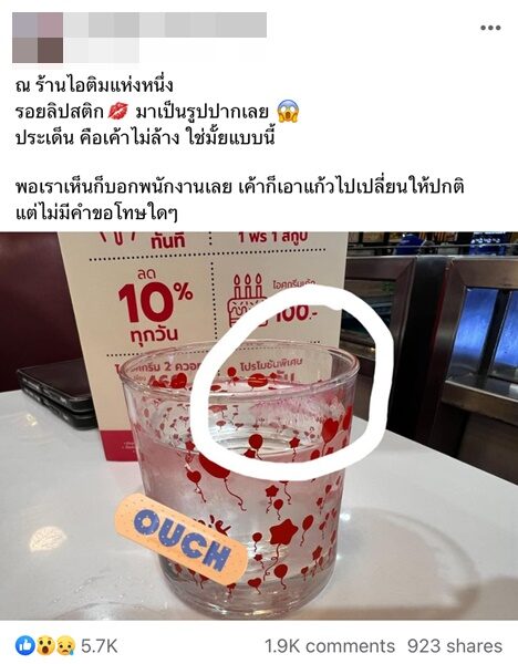 โดยระบุข้อความว่า“ณ ร้านไอติมแห่งหนึ่ง รอยลิปสติก มาเป็นรูปปากเลย ประเด็น คือเขาไม่ล้าง ใช่มั้ยแบบนี้ พอเราเห็นก็บอกพนักงานเลย เขาก็เอาแก้วไปเปลี่ยนให้ปกติ แต่ไม่มีคำขอโทษใด ๆ ”