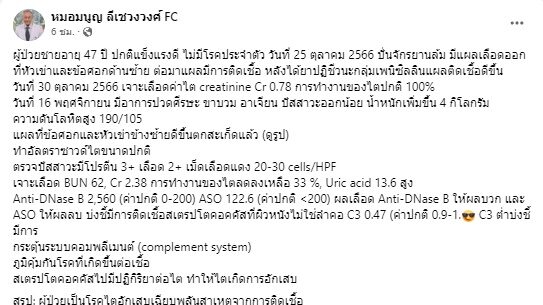 โดยระบุผ่านเฟซบุ๊ก “หมอมนูญ ลีเชวงวงศ์ FC” ไว้ว่า "ผู้ป่วยชายอายุ 47 ปี ปกติแข็งแรงดี ไม่มีโรคประจำตัว วันที่ 25 ตุลาคม 2566 ปั่นจักรยานล้ม มีแผลเลือดออกที่หัวเข่าและข้อศอกด้านซ้าย ต่อมาแผลมีการติดเชื้อ หลังได้ยาปฏิชีวนะกลุ่มเพนิซิลลินแผลติดเชื้อดีขึ้น