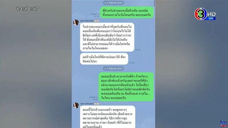 “23 กรกฎาคม วันกำหนดคืน พี่แทมโทรมาว่าพี่ดิวไม่น่าจะคืนได้ โทรมาร้องไห้ ช่วงนั้นผมเริ่มจะต้องใช้เงินแล้ว กำลังจะรวมตัวกับเพื่อนทำเครื่องดื่ม ต้องเอาเงินไปรวมกับเพื่อน”