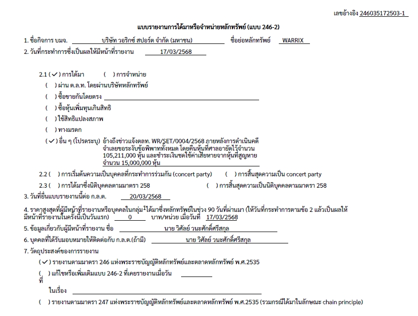 ผู้สื่อข่าวรายงานว่า วันนี้ (21 มี.ค. 68)สำนักงานคณะกรรมการกำกับหลักทรัพย์และตลาดหลักทรัพย์ (ก.ล.ต.) ได้แจ้งแบบรายงานการได้มาหรือจำหน่ายหลักทรัพย์ (แบบ 246-2) โดยนายวิศัลย์ วนะสักดิ์ศรีสกุล ประธานเจ้าหน้าที่บริหาร บริษัท วอริกซ์ สปอร์ต จำกัด (มหาชน) หรือ WARRIX อ้างถึงข่าวแจ้งตลาดหลักทรัพย์เลขที่ WR/SET/0004/2568 ภายหลังการดำเนินคดี จำเลยได้ขอระงับข้อพิพาททั้งหมด โดยคืนหุ้นที่ศาลอายัดไว้จำนวน 105,211,000 หุ้น และชำระเงินชดใช้ค่าเสียหายจากหุ้นที่สูญหายจำนวน 15 ล้านหุ้น เมื่อวันที่ 17 มีนาคม 2568 ซึ่งหุ้นที่ได้รับคืนจำนวน 105,211,000 หุ้น คิดเป็นสัดส่วน 17.8602% ของสิทธิออกเสียงทั้งหมดในกิจการ