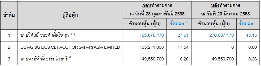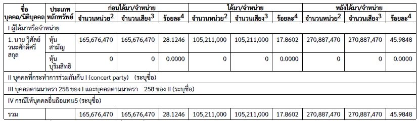 โดยหลังจากนายวิศัลย์ วนะสักดิ์สรีสกุล ได้หุ้นคืนส่งผลให้ถือหุ้นทั้งหมด จำนวน 270,887,470 หุ้น คิดเป็นสัดส่วน 45.9848% มีสิทธิออกเสียงทั้งหมดของกิจการ จากเดิมถือเพียง 165,676,470 หุ้น คิดเป็นสัดส่วน 28.1246%