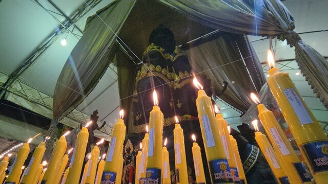 วันที่ 5 เม.ย.2568 ผู้สื่อข่าวรายงานว่า เมื่อช่วงค่ำของวันที่ 4 เดือน 4 ที่วัดสว่างอารมณ์ แคแถว ต.ขุนแก้ว อ.นครชัยศรี จ.นครปฐม พระครูยติธรรมานุยุต หรือหลวงพ่อแป๊ะ เกจิดังนครชัยศรี ได้ประกอบพิธีจุดเทียนเสริมดวง ให้กับสาธุชนเนื่องจากเป็นวันมงคล วันที่ 4 เดือน 4