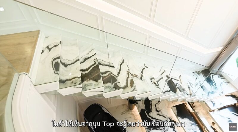 จุ๋ย บอกว่า บ้านยัง 90 เปอร์เซ็นต์ยังไม่เสร็จดีในการตกแต่ง แต่ส่วนหลักๆ เสร็จแล้ว ที่สะดุดตามากกับบันไดบ้านอย่างหรู บันไดหินอ่อนสุดโปรดภรรยา เลือกเองอย่างพิถีพิถัน