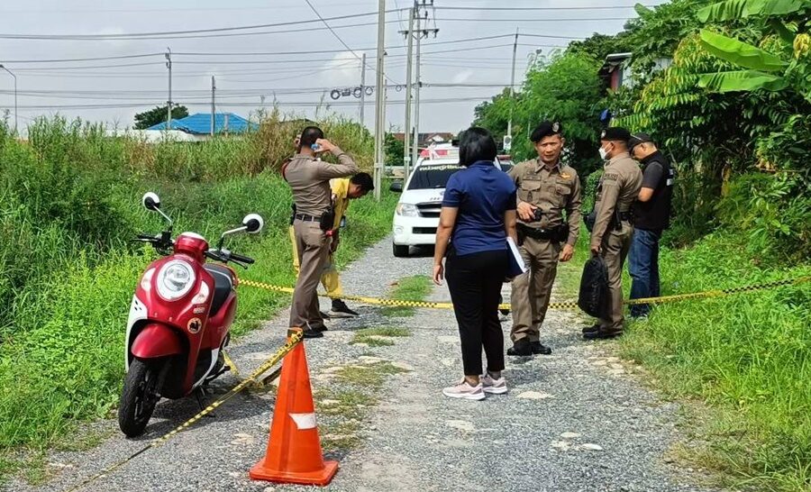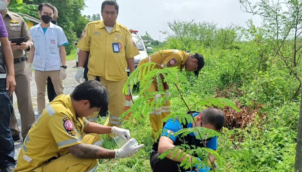 สภาพสวมเสื้อยืดสีดำ กางเกงขายาว สีน้ำเงิน นอนตะแคงขวาเสียชีวิต อยู่บริเวณพงหญ้าข้างทาง ที่ขมับด้านซ้ายมีรอยกระสุน และข้างตัวพบปืนไทยประดิษฐ์แบบหักลำ ขนาดกระสุน .38 ตกอยู่ข้างซ้ายของลำตัว มีรถจยย.ยี่ฮ้อฮอนด้า รุ่น สกูปปี้ สีแดง ทะเบียน 3 ขจ3386 กรุงเทพมหานคร จอดอยู่ข้างศพ