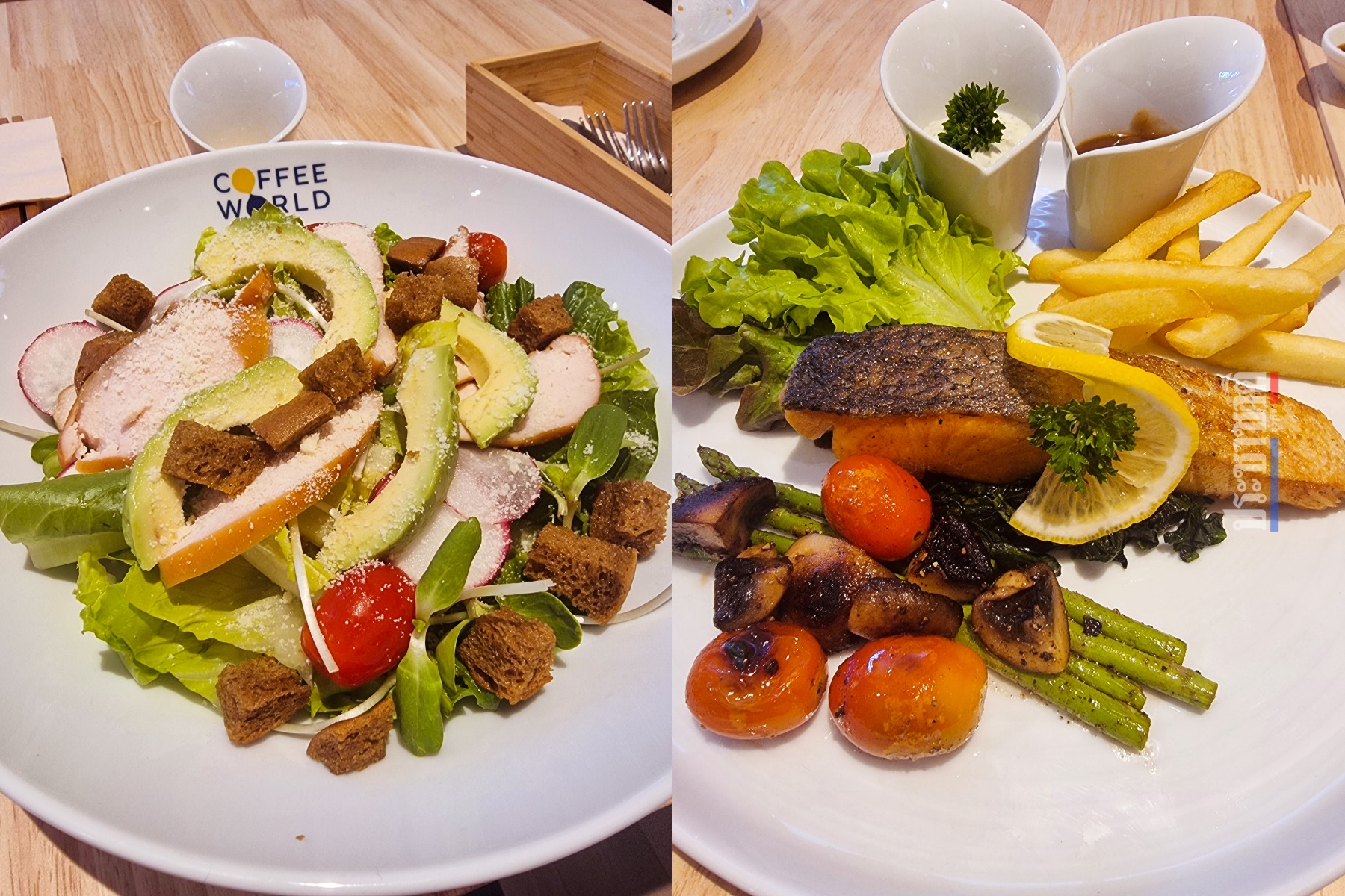 ส่วนเมนูเครื่องดื่มและอาหาร มีให้เลือกหลากหลาย ไม่ว่าจะเป็นอาหารจานเดียว สเต๊ก สลัด ของหวานต่าง ๆ เช่น สเต๊กปลา สลัดไก่ซีซาร์ ข้าวหน้าหมูสไตล์ญี่ปุ่น ตอบโจทย์มื้อเที่ยงหรือมื้อหนักได้ และยังมีเมนูโปรตีนทางเลือก (Plant-Based) เมนูสำหรับสายมังสวิรัติ (Vegetarian) และเมนูกรีกโยเกิร์ตสุขภาพจาก Pleased Yoghurt Bar ให้เลือกอีกด้วย