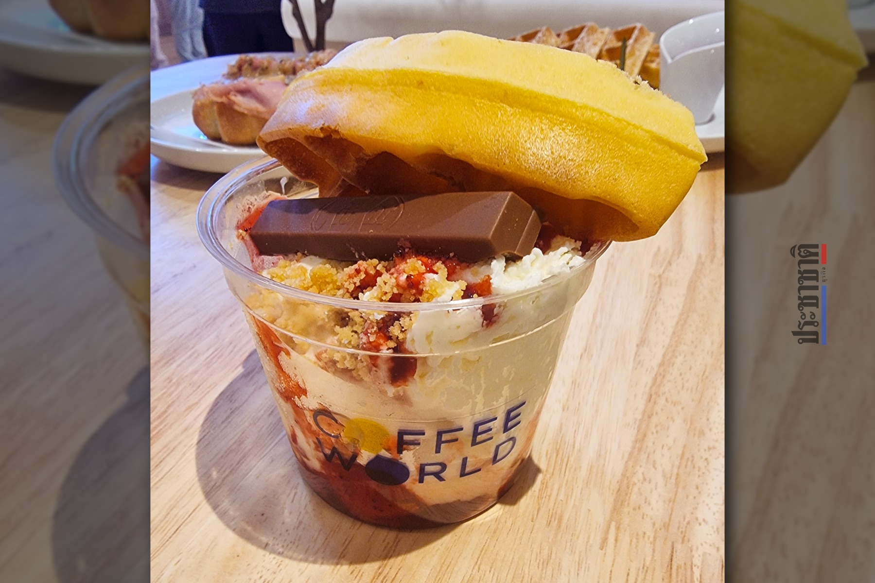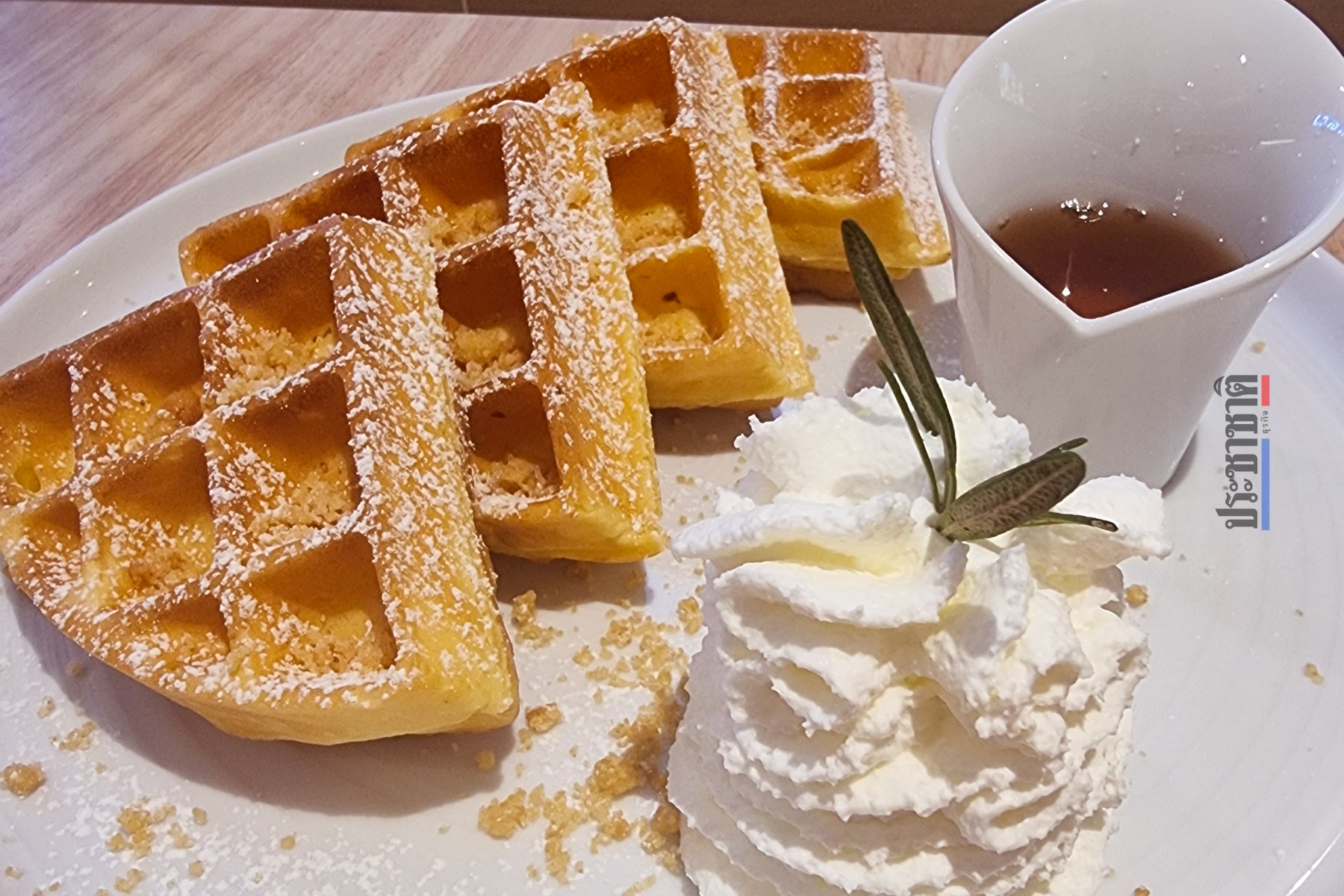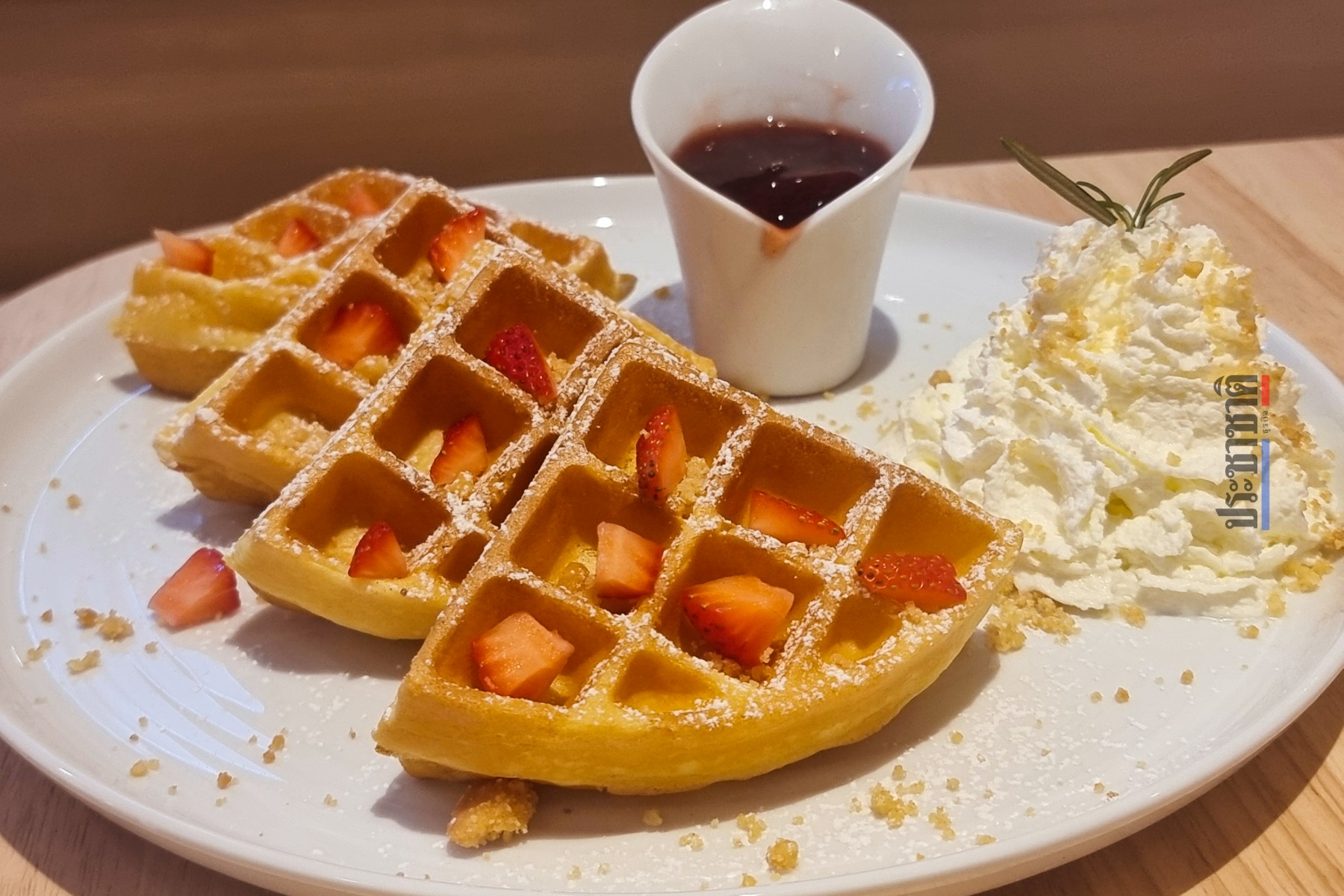 ขณะที่ของหวาน มีเป็นเมนูวาฟเฟิลให้เลือก ทั้งเมนูวาฟเฟิลพร้อมซอสต่าง ๆ จัดจานอย่างสวยงาม หรือจะเลือกเป็นวอฟเฟิลคัพ ถ้วยเล็กน่ารัก พร้อมไอศกรีม มีให้เลือกทั้งแบบเบอรี่่และบัตเตอร์สกอต