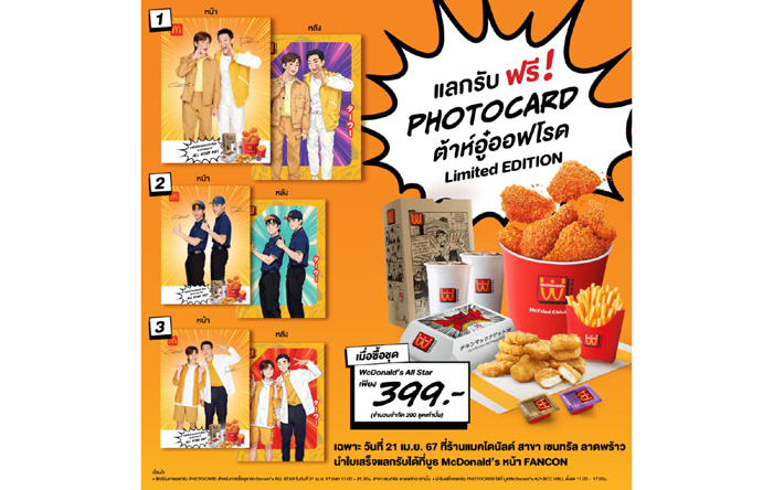 แมคโดนัลด์ จัดความฟินยกกำลังสองกับ 2 หนุ่ม 'ต้าห์อู๋ พิทยา - ออฟโรด กันตภณ' ภายในงาน “DAOU OFFROAD LOVENTURE FANCON” ที่ผ่านมา ด้วยกิจกรรมสุดเอ็กซ์คลูซีฟ! รับ Photo Card ‘ต้าห์อู๋ – ออฟโรด’ ในธีม WcDonald’s จากโลกอนิเมะ ฟรีทันทีเมื่อซื้อชุด WcDonald’s All Star ภายในวันงาน FANCON ที่แมคโดนัลด์ สาขาเซนทรัล ลาดพร้าว จำกัดเพียง 200 คนแรก เท่านั้น