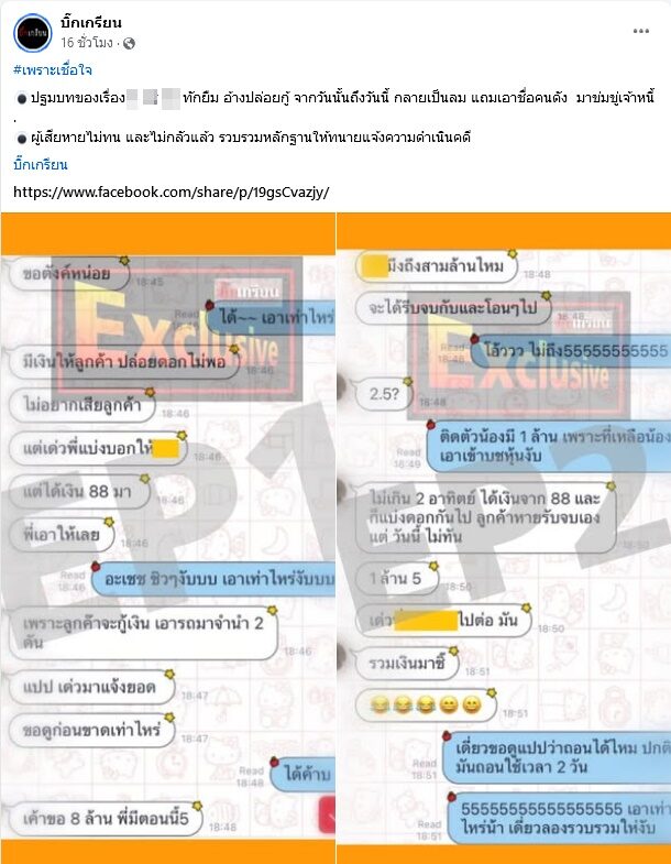 อ่านข่าวต้นฉบับได้ที่ : รอดาราสาวชี้แจง เพจดังเผยคนร้องถูกยืมเงินก้อนใหญ่ไม่คืน ตกใจบอกชื่อมาขนาดนี้