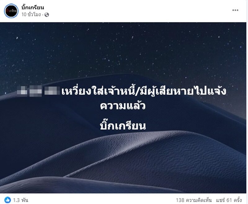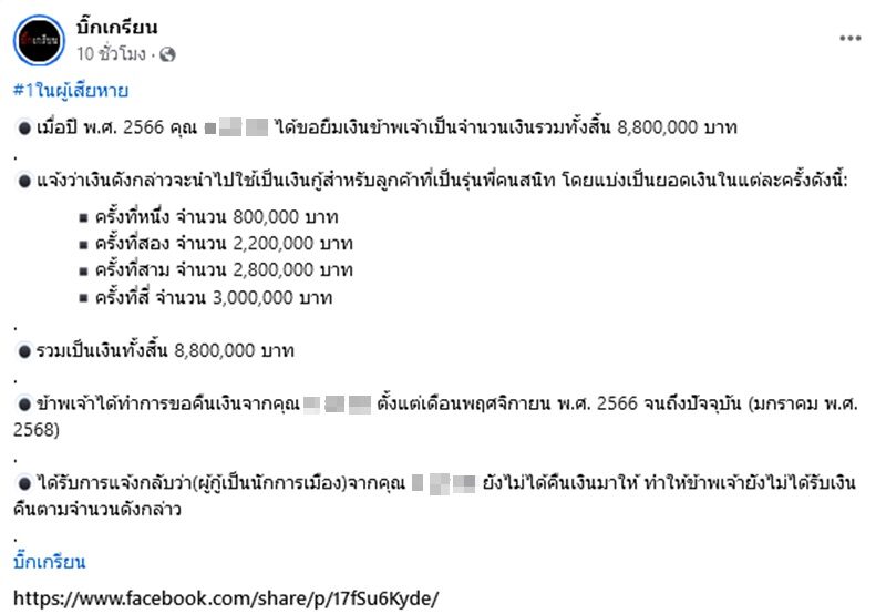 วงการบันเทิงไม่ได้พัก รอดาราสาวชี้แจง เพจดังเผยผู้เสียหายร้อง ถูกยืมเงินก้อนใหญ่ทวงไปได้รับคำตอบ อ้างนักการเมือง ผู้เสียหายแจ้งความแล้ว บอกชื่อมาขนาดนี้ตกใจ แห่วิจารณ์