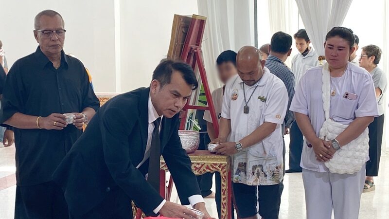โดยบรรยากาศเป็นไปด้วยความเศร้าโศก มี พระอธิการสมศักดิ์ อินฺโท เจ้าอาวาสวัดรางหมัน และ โอบะ เสียงเหน่อ" นายกสมาคมศิลปินตลกแห่งประเทศไทย พร้อมศิลปินและแฟนคลับมาร่วมพิธีรดน้ำศพด้วยความอาลัย โดยมีเลขฝาโลง 027