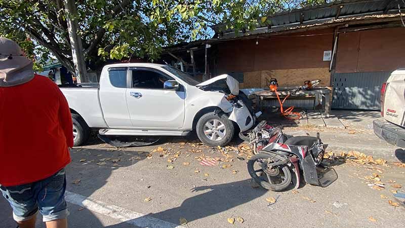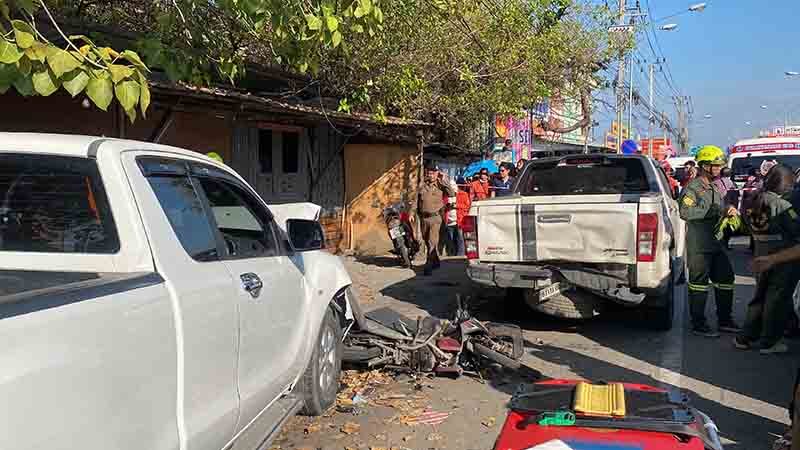 ส่วนที่หน้ารถกระบะพบรถจักรยานยนต์ สีแดง-ดำ ทะเบียน กล 6951 กรุงเทพมหานคร สภาพท้ายรถพังยับเยิน ถัดไปด้านหน้าพบรถกระบะอีซูซุ สีขาว 4 ประตู ทะเบียน 8กย 6301 กรุงเทพมหานคร ถูกชนด้านท้ายพังเสียหาย ส่วนด้านหน้าพบรถจักรยานยนต์ถูกชนพังเสียหายอีก 2 คัน