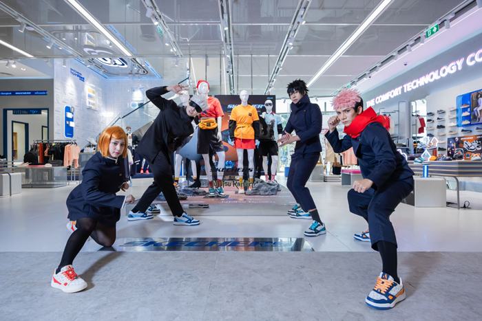 แบรนด์แอมบาสเดอร์ระดับภูมิภาคของ Skechers สวมใส่รองเท้าคอลเล็กชัน Jujutsu Kaisen StreetTM Koopa สีน้ำเงินส้ม และเสื้อยืดจากคอลเล็กชันเดียวกัน