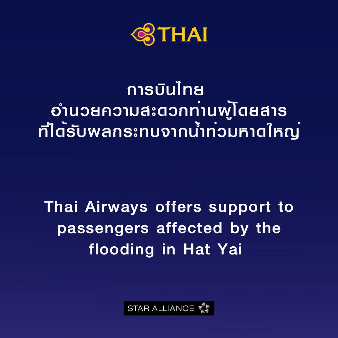 บริษัท การบินไทย จำกัด (มหาชน) ขอแจ้งการอำนวยความสะดวกสำหรับท่านผู้โดยสารที่ได้รับผลกระทบจากสถานการณ์น้ำท่วมในพื้นที่อำเภอหาดใหญ่ จังหวัดสงขลา สำหรับท่านที่ถือบัตรโดยสารของการบินไทยซึ่งออกก่อนหรือภายในวันที่ 22 พฤศจิกายน 2568 และมีแผนเดินทางเข้า–ออกท่าอากาศยานหาดใหญ่ ระหว่างวันที่ 22–30 พฤศจิกายน 2568 สามารถดำเนินการได้ดังนี้