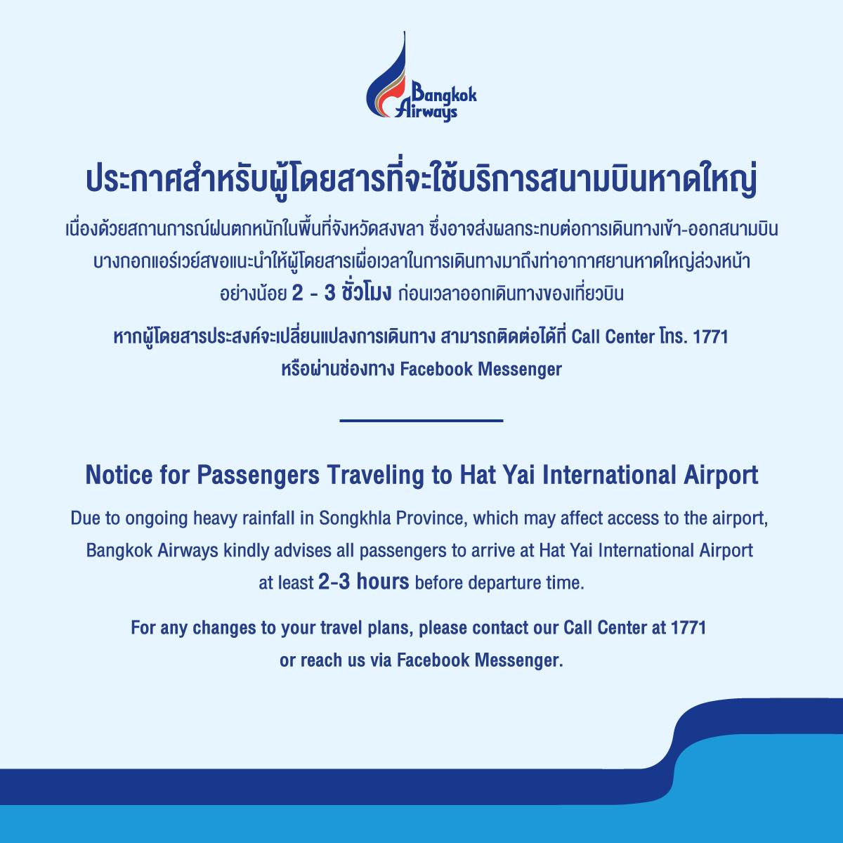 สายการบินบางกอกแอร์เวย์ส ระบุว่า เนื่องด้วยสถานการณ์ฝนตกหนักในพื้นที่จังหวัดสงขลา ซึ่งอาจส่งผลกระทบต่อการเดินทางเข้า-ออกสนามบิน บางกอกแอร์เวย์สขอแนะนำให้ผู้โดยสารเผื่อเวลาในการเดินทางมาถึงท่าอากาศยานหาดใหญ่ล่วงหน้าอย่างน้อย 2 – 3 ชั่วโมงก่อนเวลาออกเดินทางของเที่ยวบิน