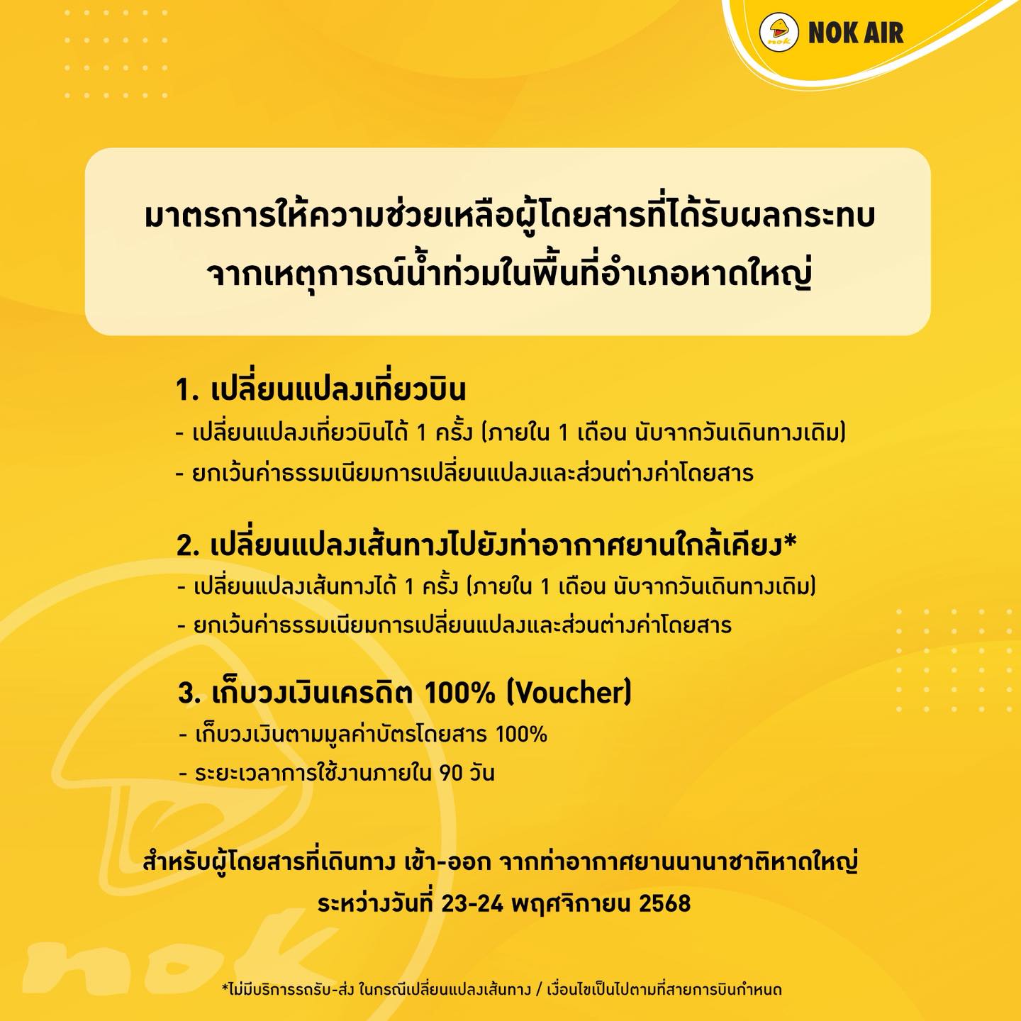 สายการบินนกแอร์ ออกมาตรการให้ความช่วยเหลือผู้โดยสารที่ได้รับผลกระทบจากเหตุการณ์น้ำท่วมในพื้นที่อำเภอหาดใหญ่ จังหวัดสงขลา สำหรับผู้โดยสารที่เดินทาง เข้า-ออก จากท่าอากาศยานนานาชาติหาดใหญ่ ระหว่างวันที่ 23-24 พฤศจิกายน 2568