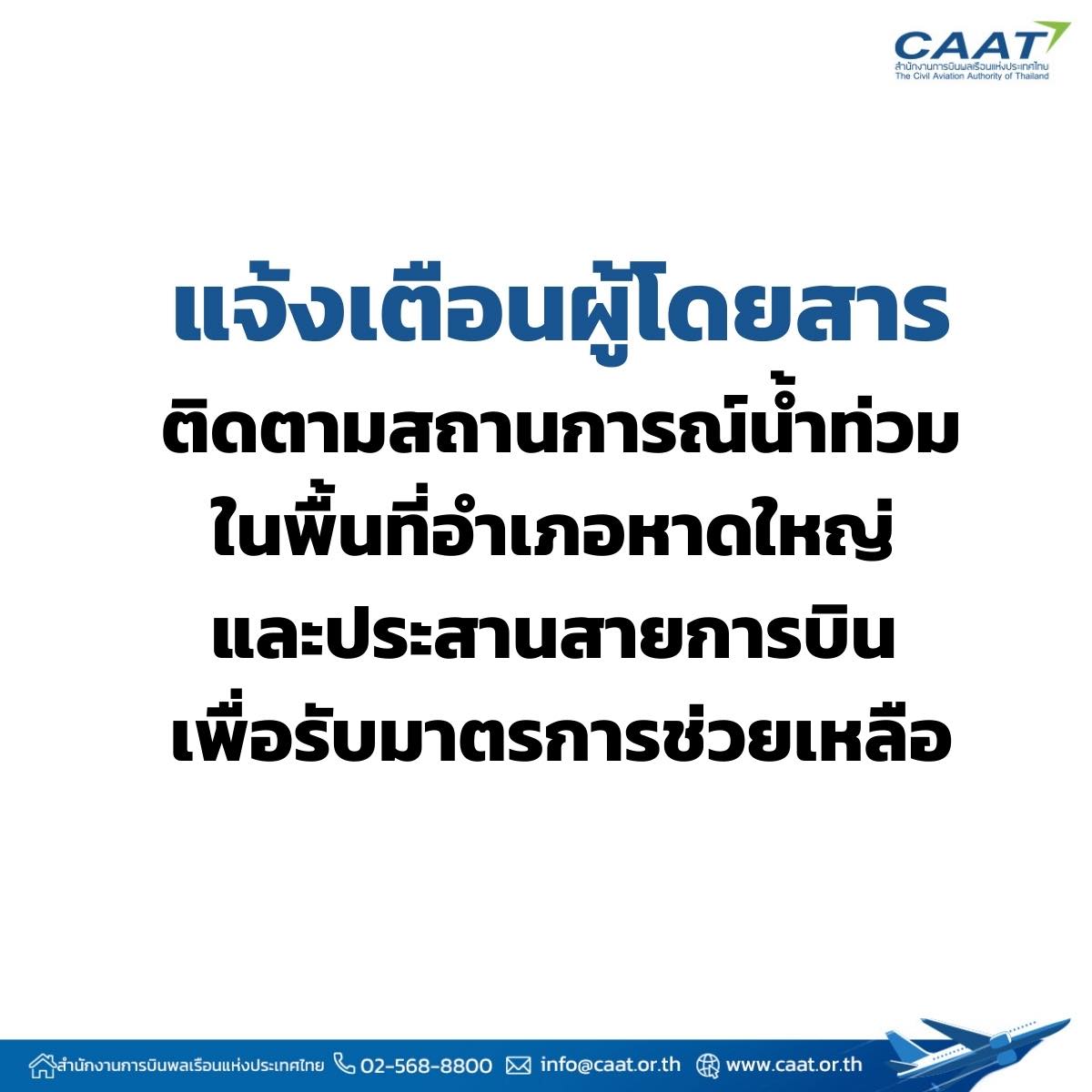 ด้านสำนักงานการบินพลเรือนแห่งประเทศไทย (CAAT) มีการแจ้งเตือนผู้โดยสารติดตามสถานการณ์น้ำท่วมในพื้นที่อำเภอหาดใหญ่ และประสานสายการบินเพื่อรับมาตรการช่วยเหลือ