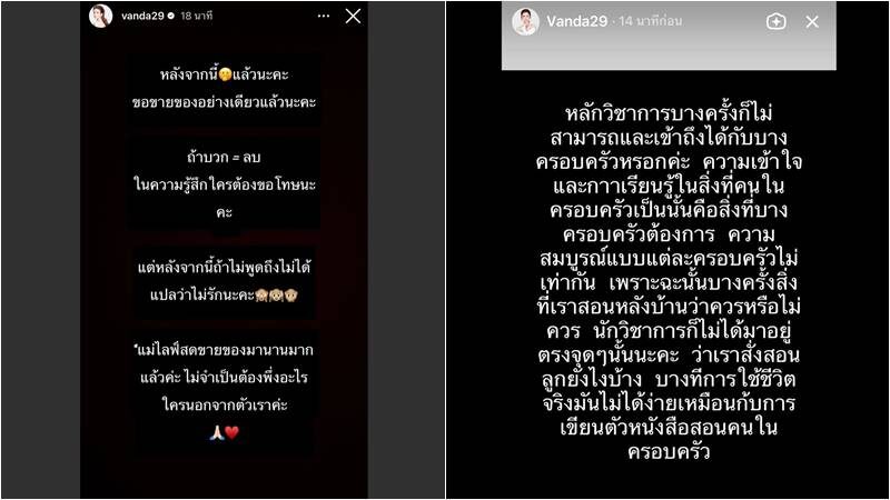 พร้อมกันนี้ โบว์ แวนดา ได้เขียนแคปชั่นบอกว่า “ถ้าคลิป 2 นาทีที่ทุกคนเห็น สร้างความไม่สบายใจต่อความรู้สึกของใคร แม่ต้องขออภัยนะคะ แต่จะบอกว่าหลังบ้านเราให้ความสำคัญกับความรู้สึกของคนในครอบครัว เราเรียนรู้จากความรู้สึกคนในครอบครัวเป็นหลัก เด็กๆ มั่นใจได้เลยนะคะว่า แม่เลี้ยงเดี่ยวคนนี้ดูแลเจย์มาได้อย่างเต็มที่ ถึงแม้บางครั้งเราต้องเจอกับสถานการณ์ที่มันยากลำบาก แต่เราก็สามารถผ่านมันมาได้ ด้วยความรักและความเข้าใจของคนในครอบครัวค่ะ”