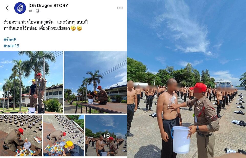 กลายเป็นประเด็นร้อนแรงในโลกโซเชียล หลัง เพจเฟซบุ๊ก IO5 Dragon STORY ได้โพสต์ภาพตำรวจขณะเข้าแถวเป็นระเบียบ โดยครูฝึกได้บีบครีมกันแดดหลายยี่ห้อใส่ถังรวมกัน แล้วนำมาทาผิวให้กับตำรวจที่มารับการฝึก