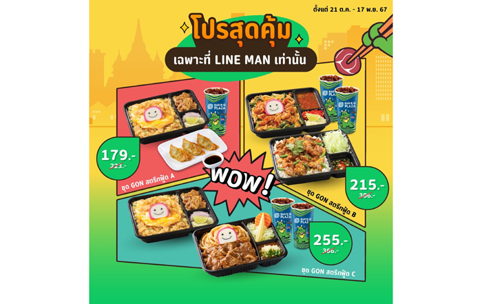 เอนจอยไปกับเมนูใหม่ "GON สตรีทฟู้ด" ที่เพิ่มเสน่ห์รสชาติอาหารไทยให้จัดจ้านยิ่งขึ้นในราคาเริ่มต้นเพียง 89 บาท สั่งง่ายผ่านช่องทางเดลิเวอรี่ LINE MAN และ Gon Gang Delivery พร้อมให้คุณสัมผัสความอร่อยที่สะดวกสบายถึงที่ทุกวัน กับเมนูข้าวหมูทอดกระเทียมพริกลูกโดด, ข้าวกระเทียมกากหมูเจียวไข่ข้นกับหมูบาร์บีคิว และ GON หมูกระทะผัด พร้อมเสิร์ฟความอร่อยตั้งแต่วันที่ 21 ตุลาคม 2567 เป็นต้นไป
