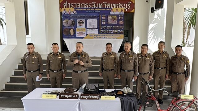 เมื่อเวลา 10.30 น. วันที่ 24 ต.ค.2567 ที่กองบังคับการตำรวจภูธรจังหวัดเพชรบุรี อ.เมือง จ.เพชรบุรี พล.ต.ท.นัยวัฒน์ ผะเดิมชิต ผบช.ภ.7 พร้อมด้วย พล.ต.ต.กิตติ สุขสมภักดิ์ ผบก.ภ.จว.เพชรบุรี และ พ.ต.อ.สมเกียรติ โฉมฉาย ผกก.สภ.ชะอำ ร่วมกันแถลงจับกุมตัว นายวิรัช หรือ แป๊ะ (ขอสงวนนามสกุล) อายุ 41 ปี ผู้ต้องหาตามหมายจับศาลจังหวัดเพชรบุรี