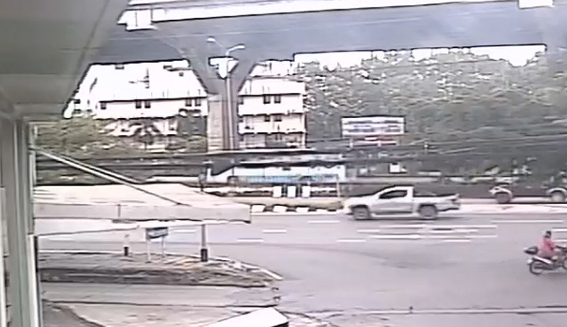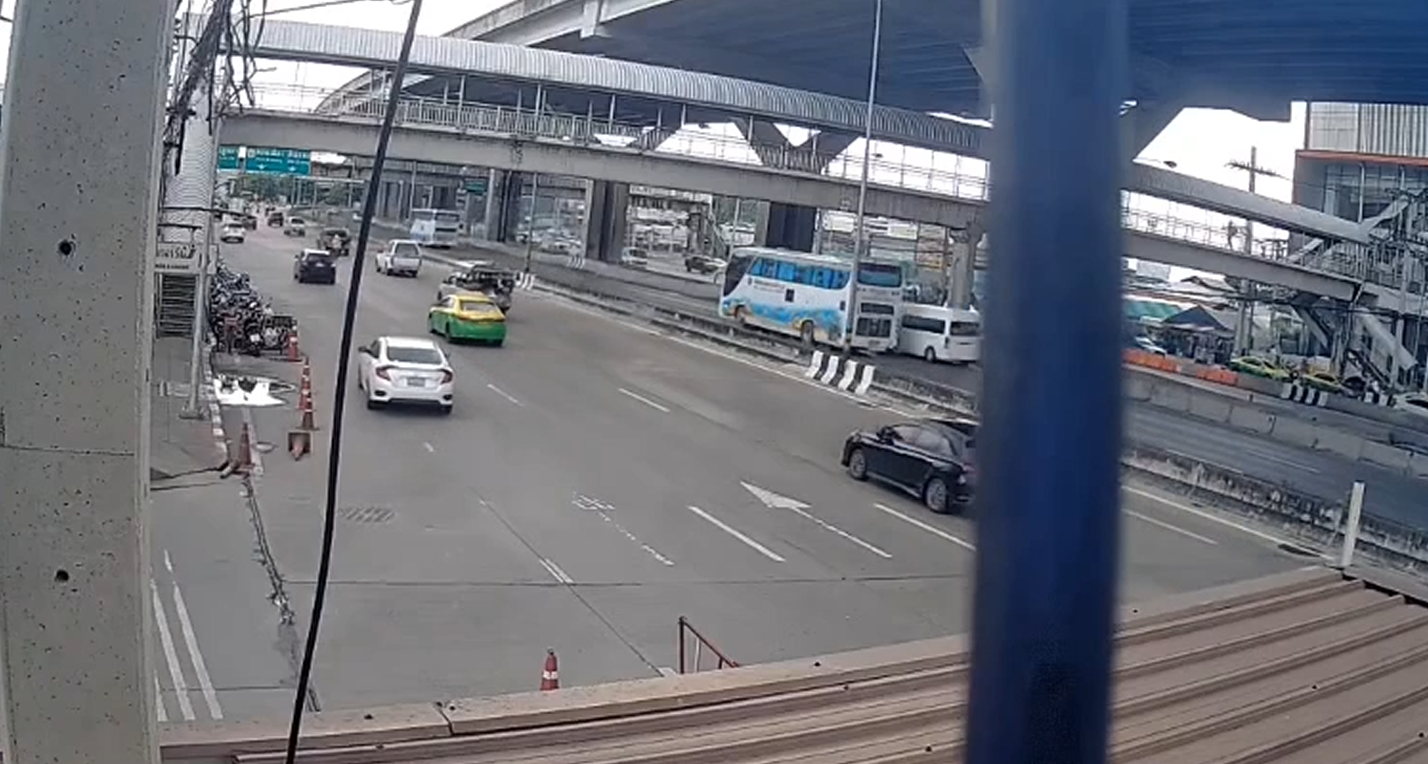 เปิดภาพวงจรปิด รถบัสทัศนศึกษา ขับเซไปมาชนเบนซ์ ก่อนเสยเกาะกลางไฟไหม้