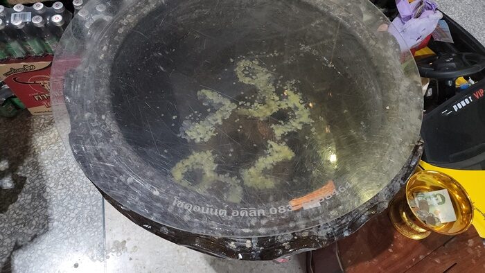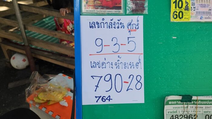 เลขตาทองงิ้วราย แผงหวยในวัดสว่างอารมณ์ ติดเลข 9 3 และเลขหยดน้ำตาเทียนในอ่างน้ำมนต์ 7-9-0 , 280 , 764