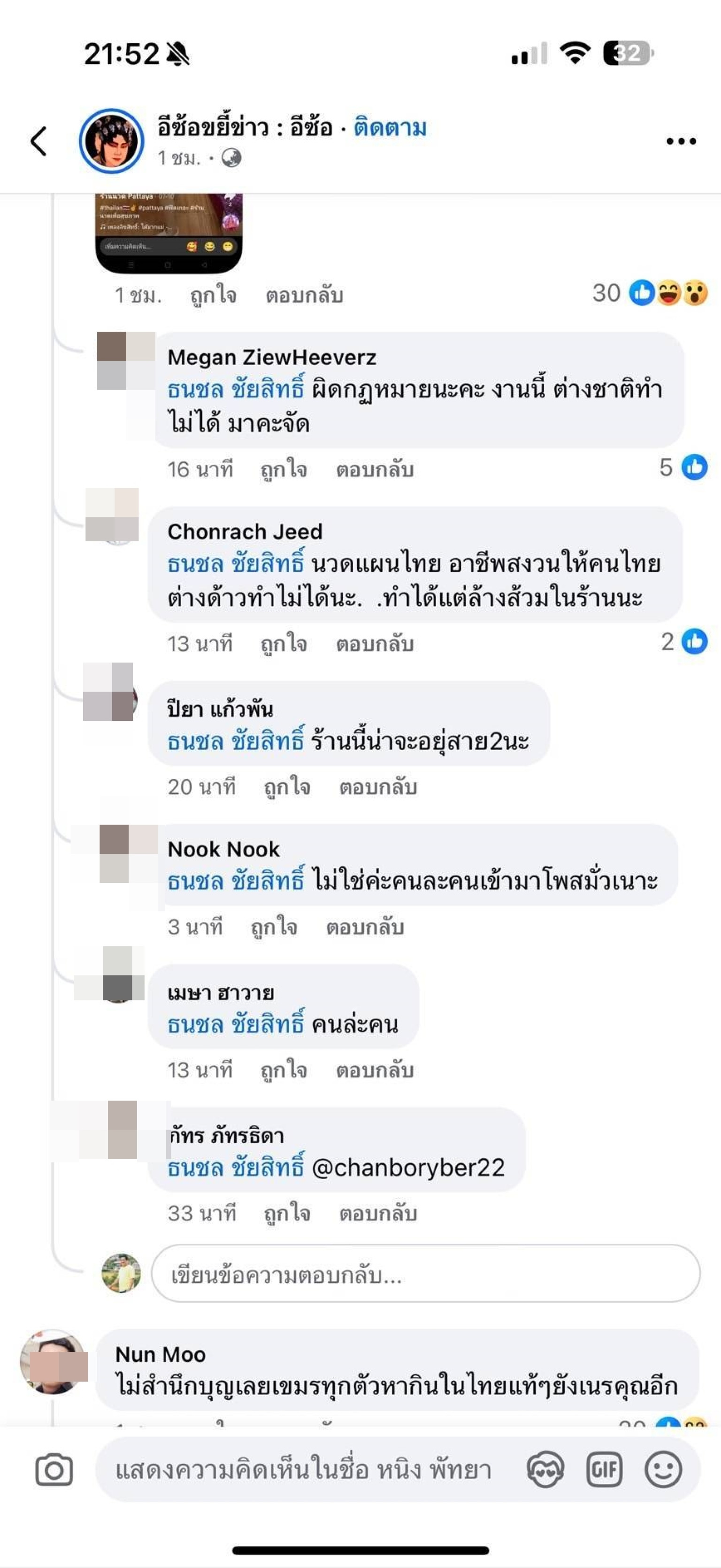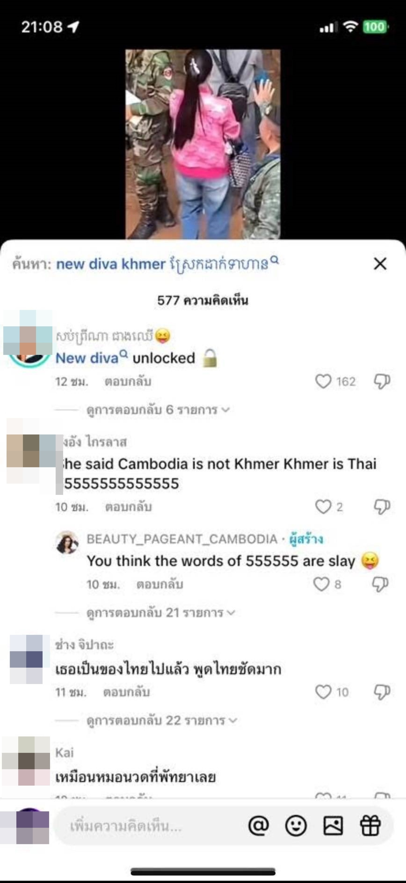 ตามที่ มีกระแสข่าวเพจดัง อย่างอีซ้อขยี้ข่าว ได้โพสต์ภาพพร้อมข้อความ ล่าสุด มีคนบอกนางเป็นหมอนวดที่พัทยาจริง ว่าแต่ซอยไหน โดยคลิปเรื่องเป็นหญิงสาวใส่เสื้อคลุมสีชมพู เป็นสาวกัมพูชาที่ไปยืนด่าคนไทยที่ปราสาทตาเมืองธม ทำให้มีการวิพากษ์วิจารณ์กันอย่างหนักในโลกออนไลน์