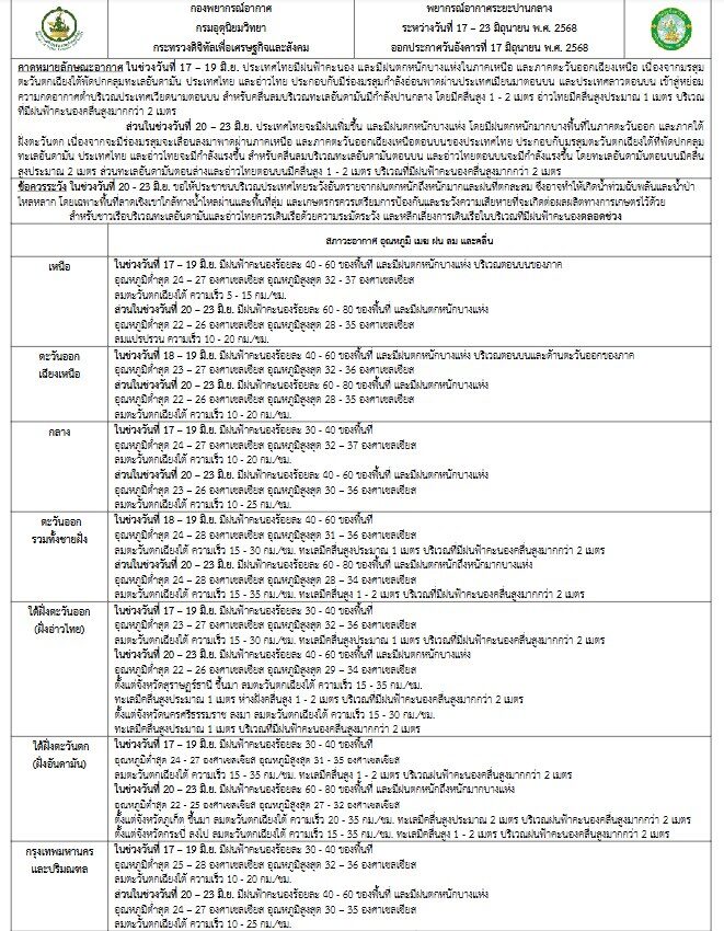 ขณะเดียวกัน กรมอุตุนิยมวิทยา คาดหมายอากาศทั่วไป ระหว่างวันที่ 17–23 มิถุนายน พ.ศ.2568 ดังนี้